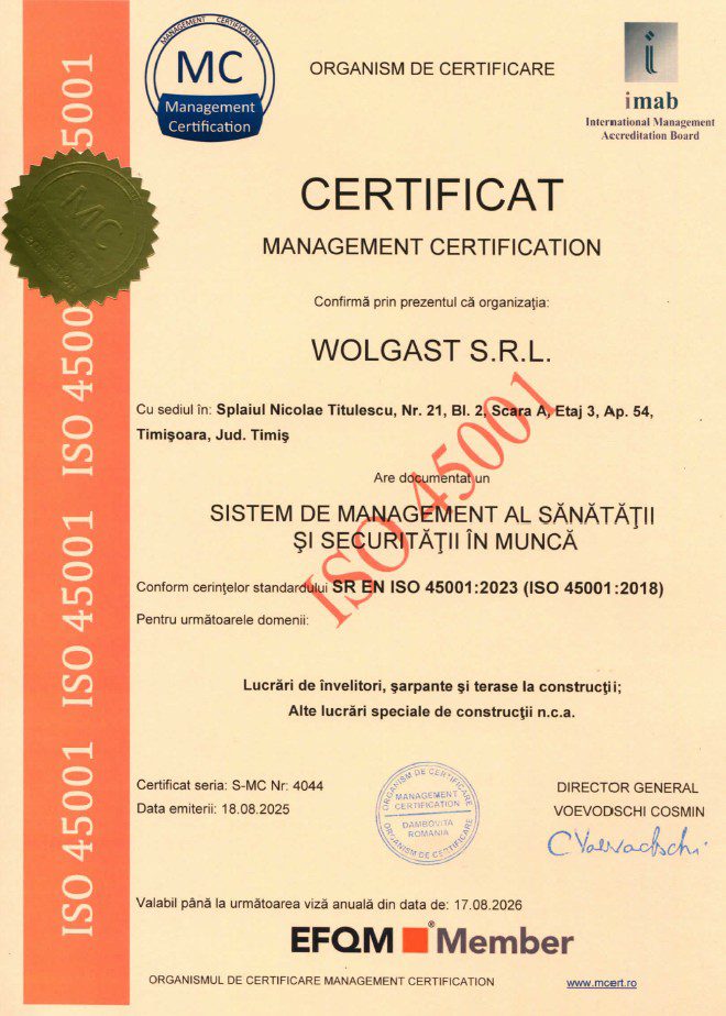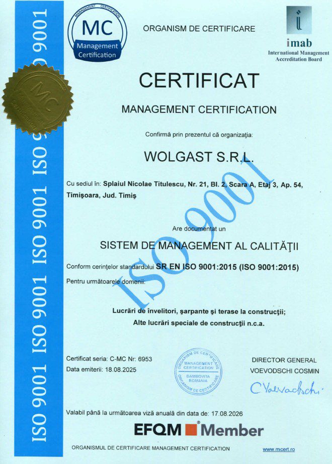La Wolgast S.R.L. punem pe primul loc calitatea serviciilor și siguranța clienților noștri. Pentru a confirma acest angajament, compania noastră deține trei certificări internaționale ISO, recunoscute la nivel global și verificate de organisme acreditate.